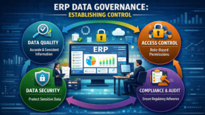 Data governance defines how data is managed, maintained, and protected within an organization. Effective ERP data governance ensures that data remains accurate and trustworthy over time. Key components of data governance include: